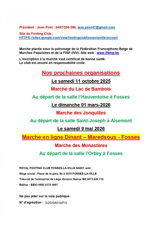 | Contact | Responsable: Jean Piret Tel: 071/71.20.94 GSM: 0497/53.83.96 E-mail: na001@ffbmp.be https://sites.google.com/view/footingclubfosseslaville https://www.facebook.com/groups/3179750229011524 |
