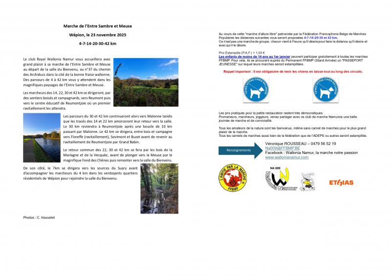 | Contact | Responsable: Véronique Rousseau GSM: 0479/56.52.19 E-mail: na009@ffbmp.be https://www.wallonianamur.com/ https://www.facebook.com/groups/3046935708883956 |